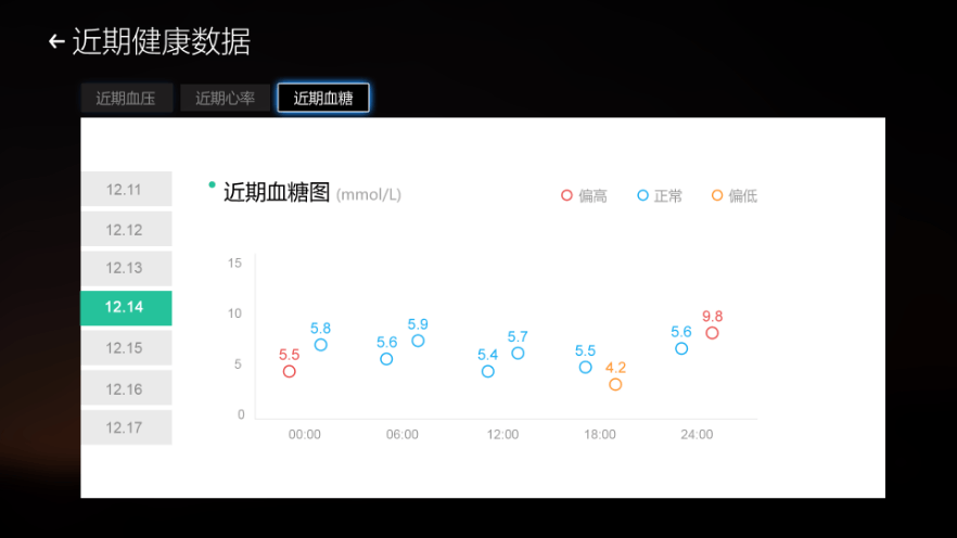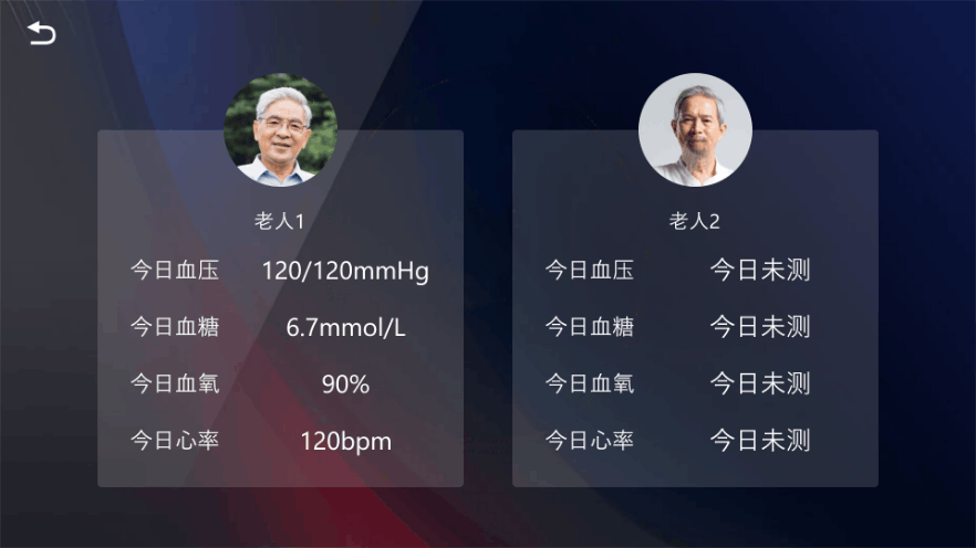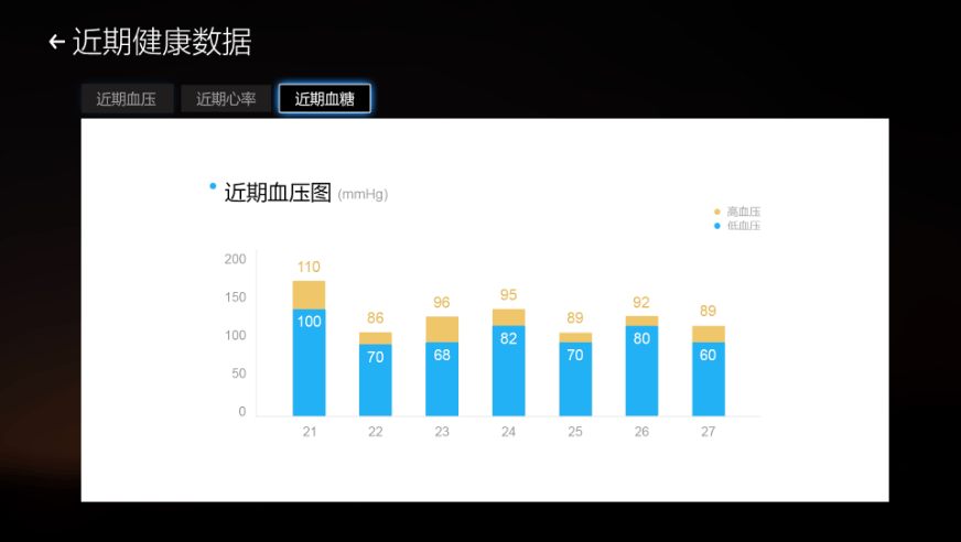 通過可視化工作站在線可建立老人的健康檔案。老人每日用智慧養老配套健康外設測 量血壓、血糖、心電等,測量完后的數據將會實時的傳送到電視、手機端app以及可 視化工作站。老人可以在電視上實時查看自己的數據,子女可以通過手機端查看數據, 醫養工作站可以通過后臺來查看老人數據。三位一體的為老人健康數據進行監測,為 老人的健康做保障。