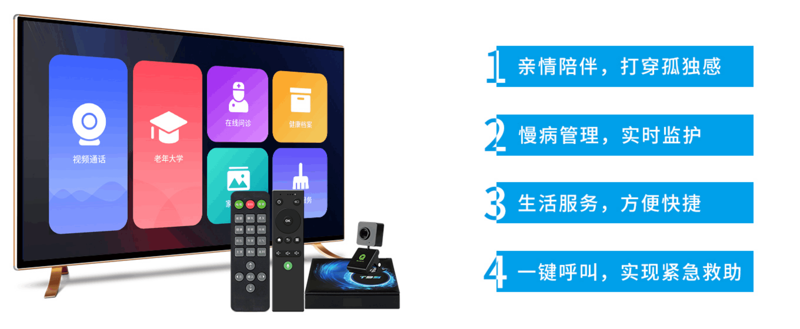 親情陪伴:老人可以通過遙控器與子女進行視頻溝通,增加情感交流,促進親情陪伴